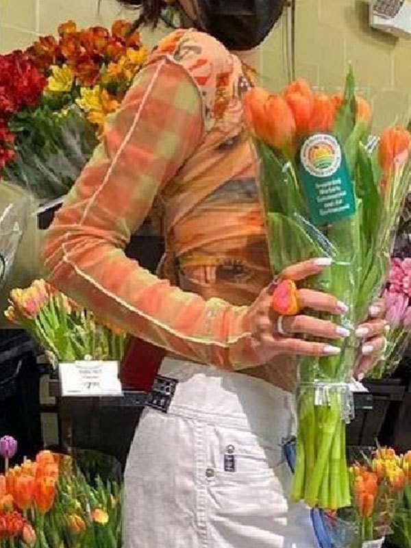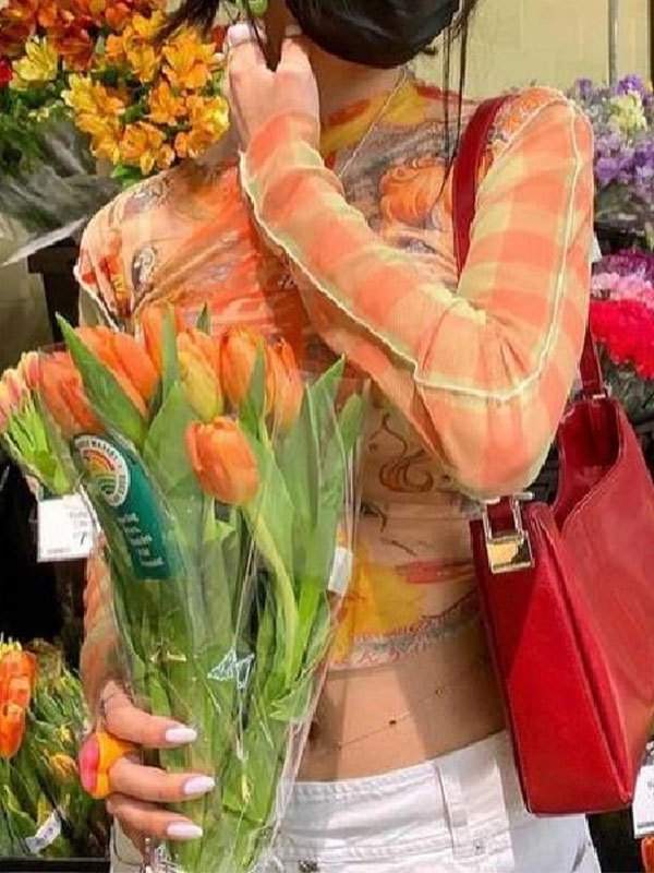 Stil: Street, Sweet Farbe: Orange Stoff-Inhalt: Polyester, Baumwolle Passform: Slim Fit Ausschnitt: Rundhalsausschnitt Ärmellänge: Langarm Das orangefarbene Mesh-Top ist die Farbe der Sommerzeit! Mit verkürzter Länge, genähten Details und kariertem Anime-Muster rundum, um an heißen Tagen süß auszusehen.